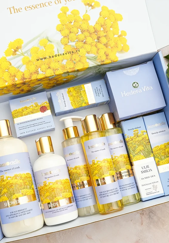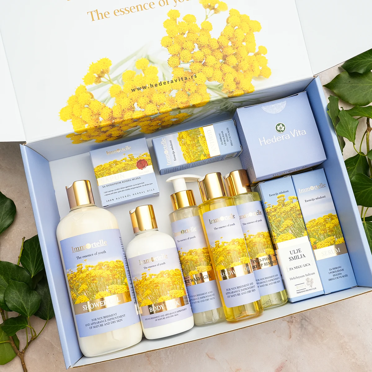 Immortelle Lux set sadrži 10 proizvoda + elegantnu poklon kutiju. Gel za tuširanje i sapun čiste kožu bez isušivanja. Uljana kupka i mleko za telo neguju i omekšavaju kožu tela.